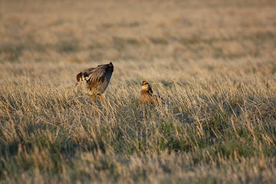 The "booming" ground is called a lek, which about a dozen males showed up to this weekend. Only three females came in to check them out, but I was too busy trying to watch everything that I missed any actual matings. Generations of these chickens have most likely been coming back to this site for years. It was a great opportunity and I encourage everyone to make an attempt to sit in on this spectacle if they ever get the chance.